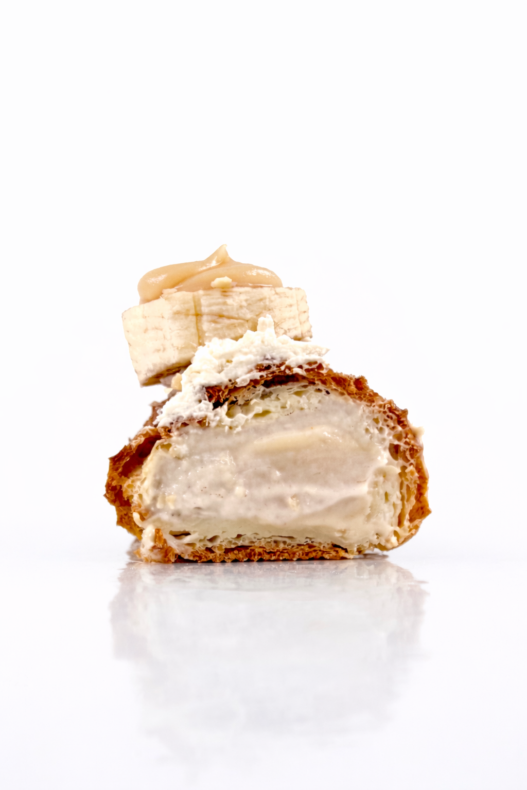 Banaanikreemi, valmistettu oikeista tuoreista banaaneista. Voit myös valita lisätäytteeksi Nutellan tai karamellin